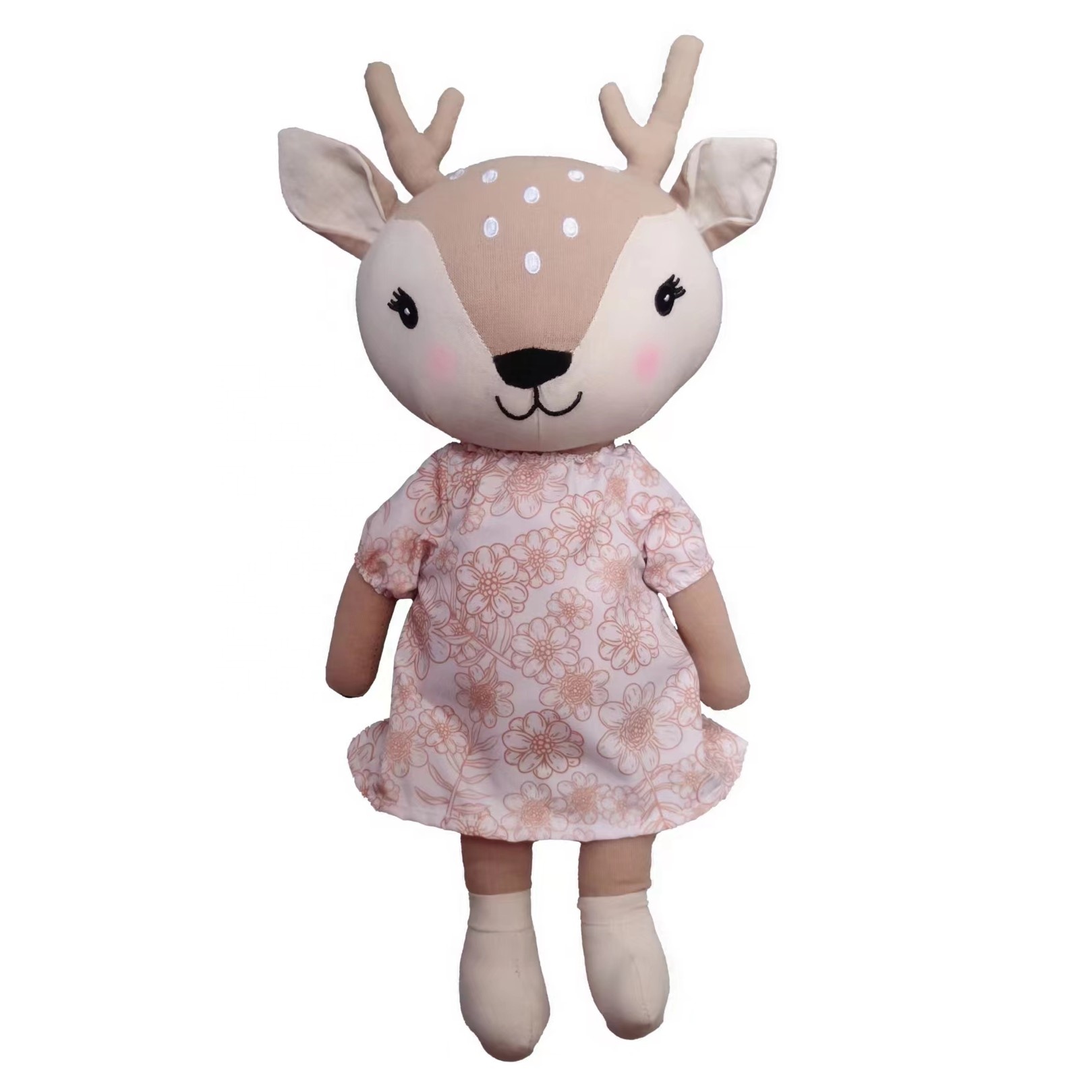 Güzel elbise ile özelleştirilmiş 100% pamuk peluş geyik bebek dolması hayvan peluş oyuncak bebek zengin deneyim için OEM bebek oyuncak